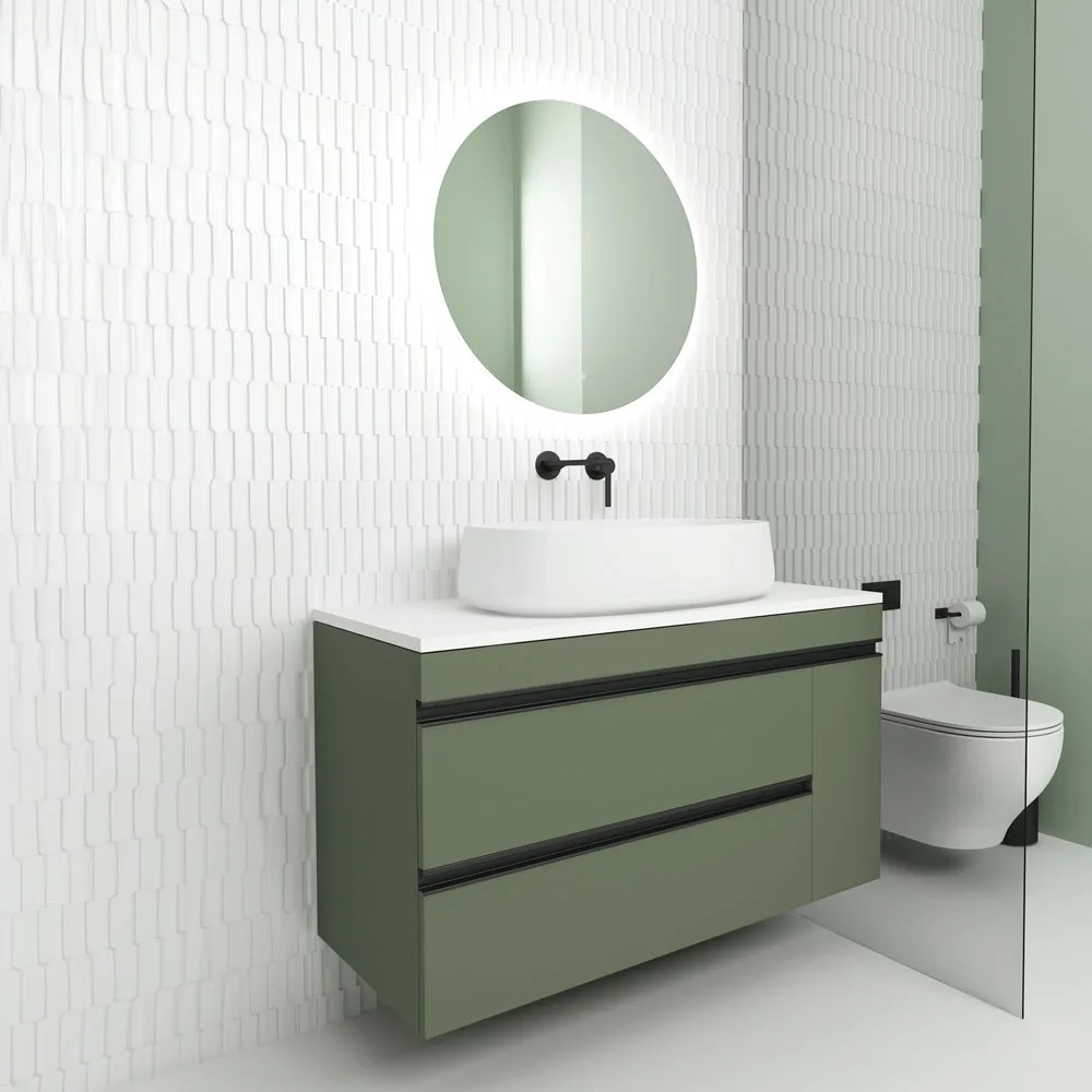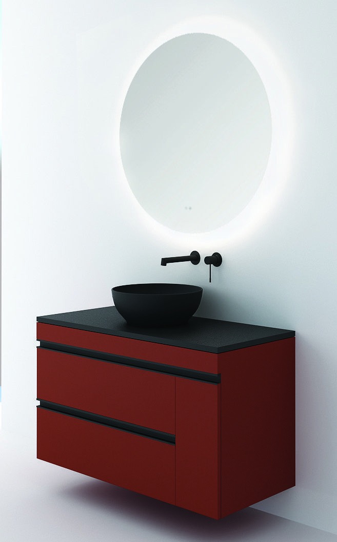 Κρεμαστό έπιπλο μπάνιου Orabella της σειράς Vision. Κατασκευασμένο από ανθυγρή μελαμίνη με πάγκο από HPL μαύρο ματ. Συμπεριλαμβάνει δύο συρτάρια (άνω-κάτω) με μεταλλική χούφτα Inox Brushed. Μπορεί να συνδυαστεί με καθρέπτη ντουλάπα, φωτιστικό Led και νιπτήρα πορσελάνης, κατόπιν επιλογής.